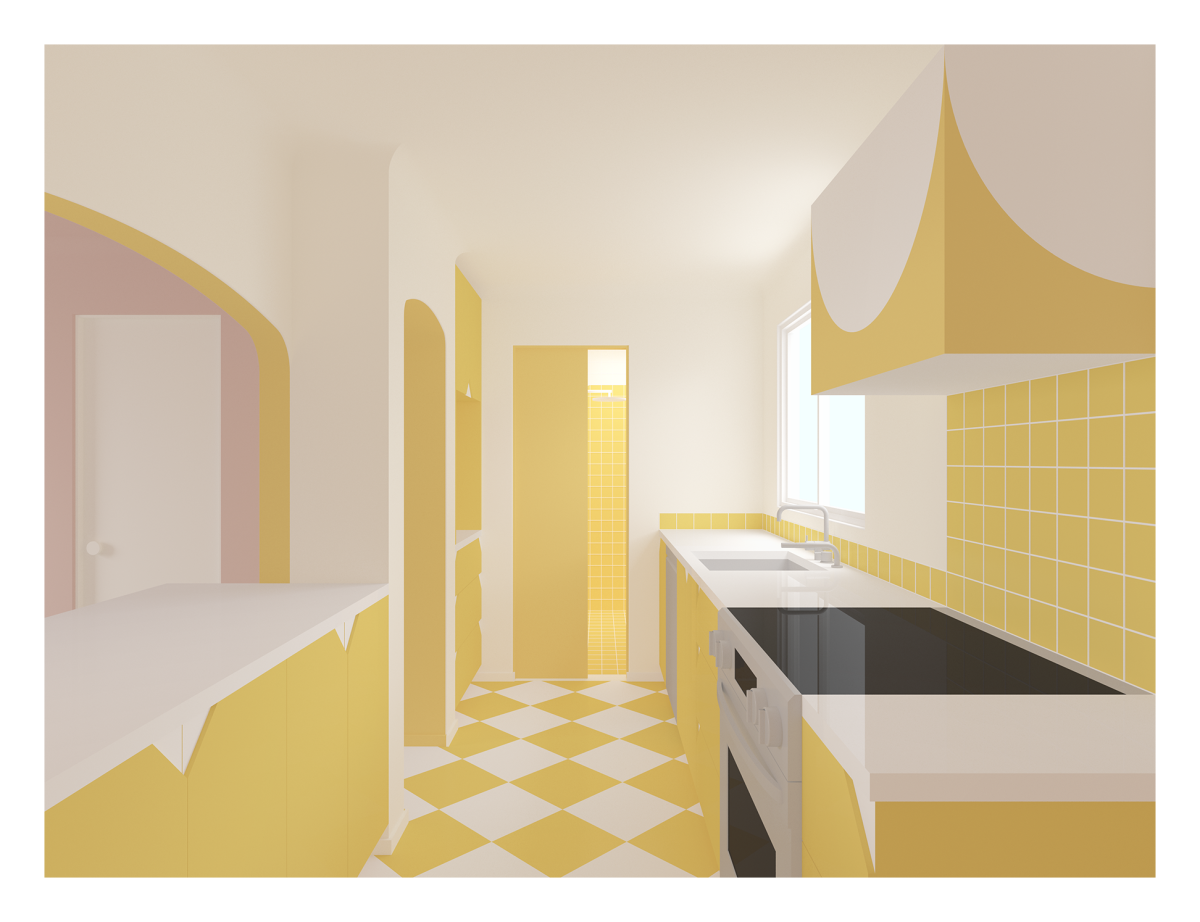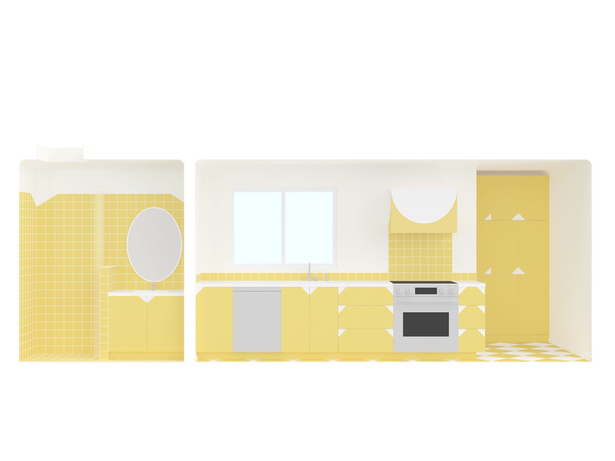 A new compact kitchen and bathroom for a small cottage in the hills of Echo Park. Because the existing 1923 kitchen and bathroom aren't salvageable we bring the original color palate of yellow and white into the future in their same footprint. To add nuance we reimagine the detailing of the original cabinets as a 2D inlay in tile and laminates.