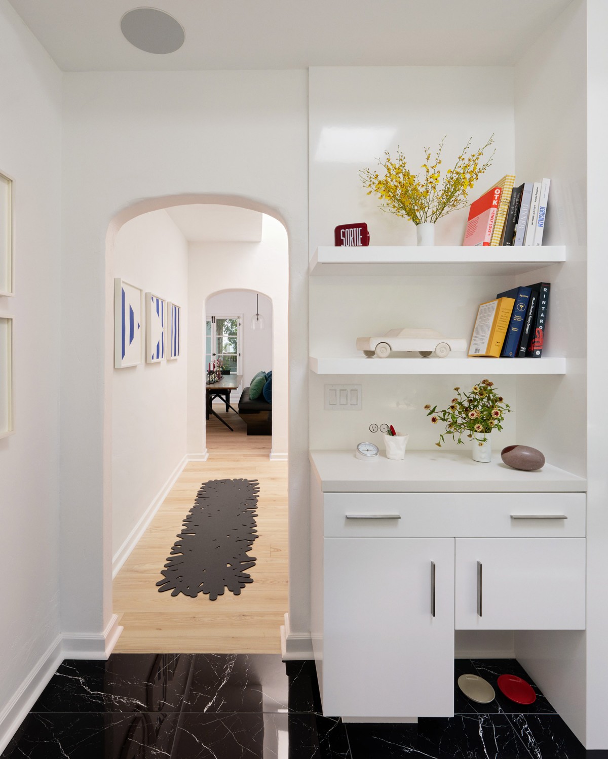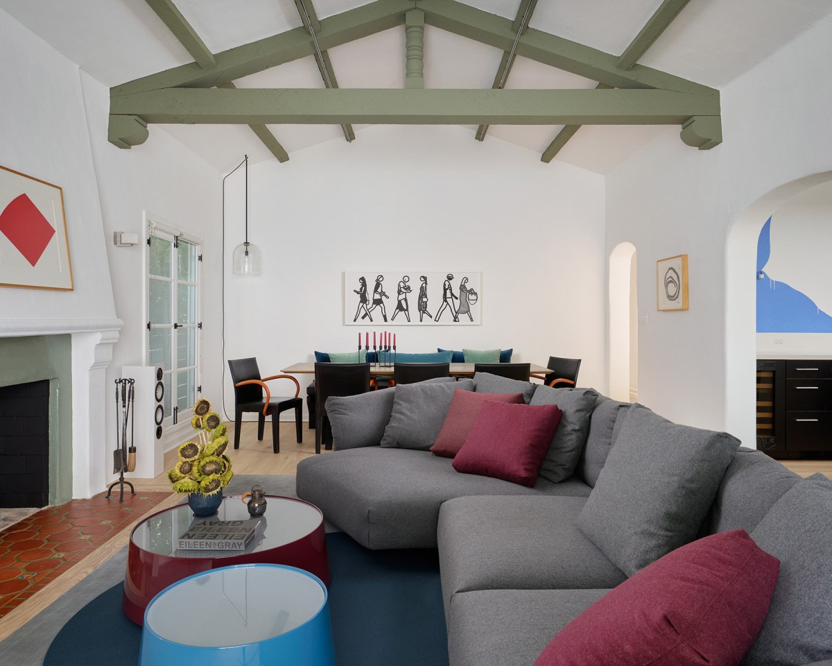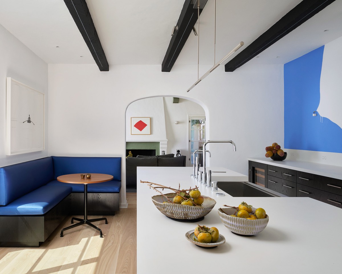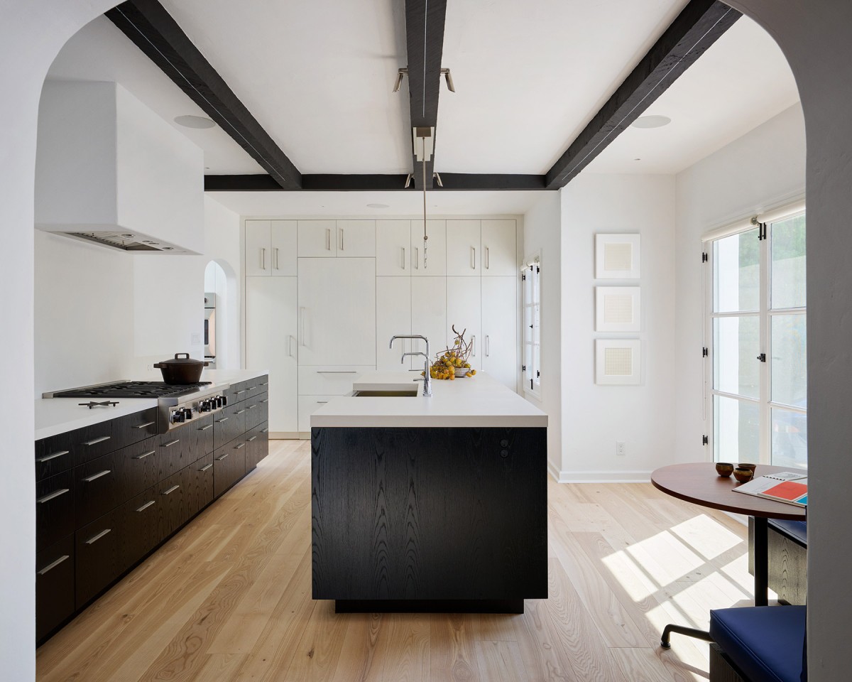 A reworking of the primary spaces of a 1928 Spanish Revival Bungalow in Los Angeles to create a vibrant living room, dining room, entertaining kitchen and a multifunctional butler's pantry, laundry suite and household task desk from a warren of cramped rooms. The new layout is carefully calibrated for the art collector client to live along side her favorite works throughout the house. A palette of black and white in the new kitchen and butler's pantry plays on the white box of the gallery and black box of the theater to evoke the new public nature of these rooms as display spaces. In the living and dining room the new furnishings and textiles offer a soft partner in muted and saturated colors to the art hung in the large room while making it perfect for lounging.