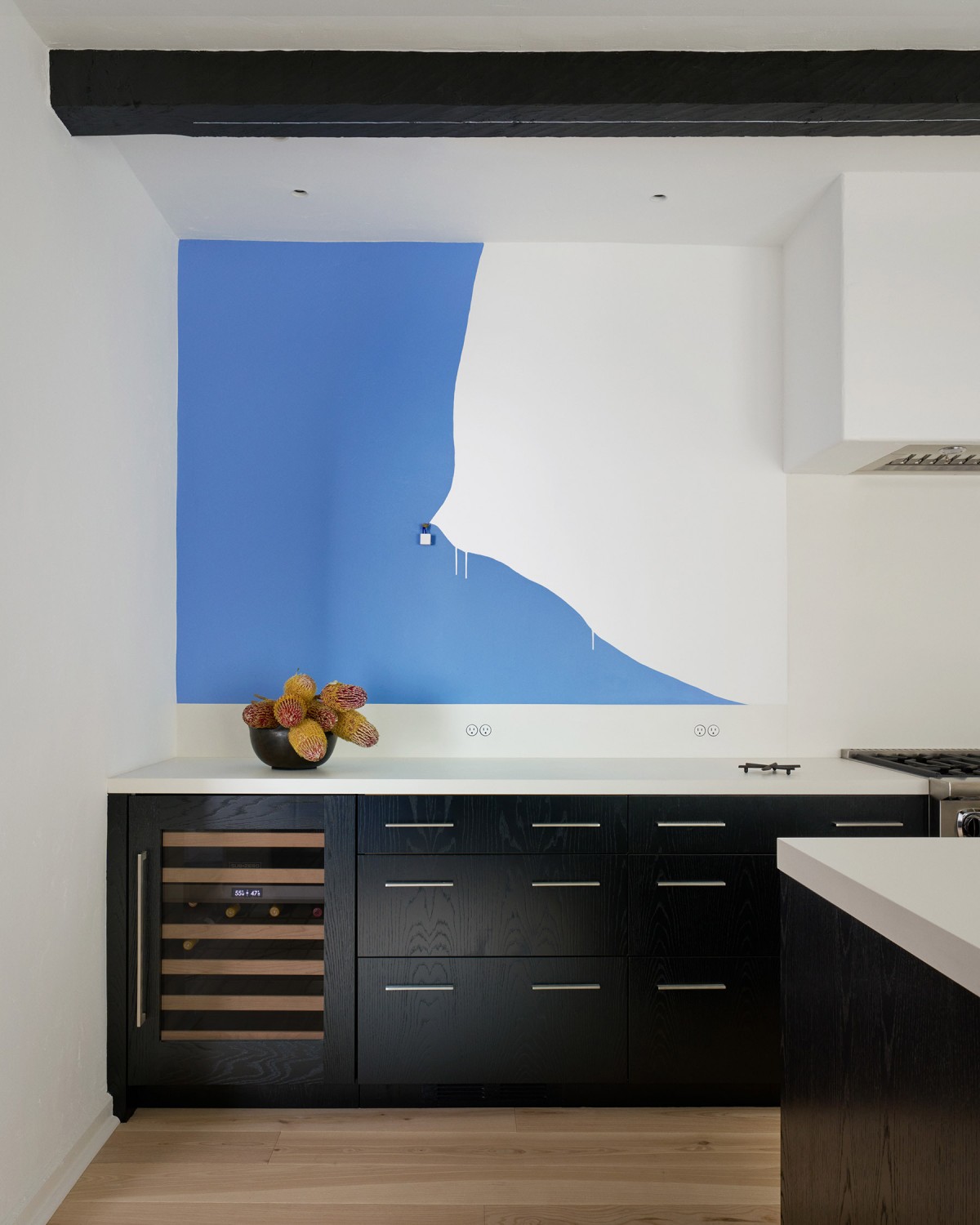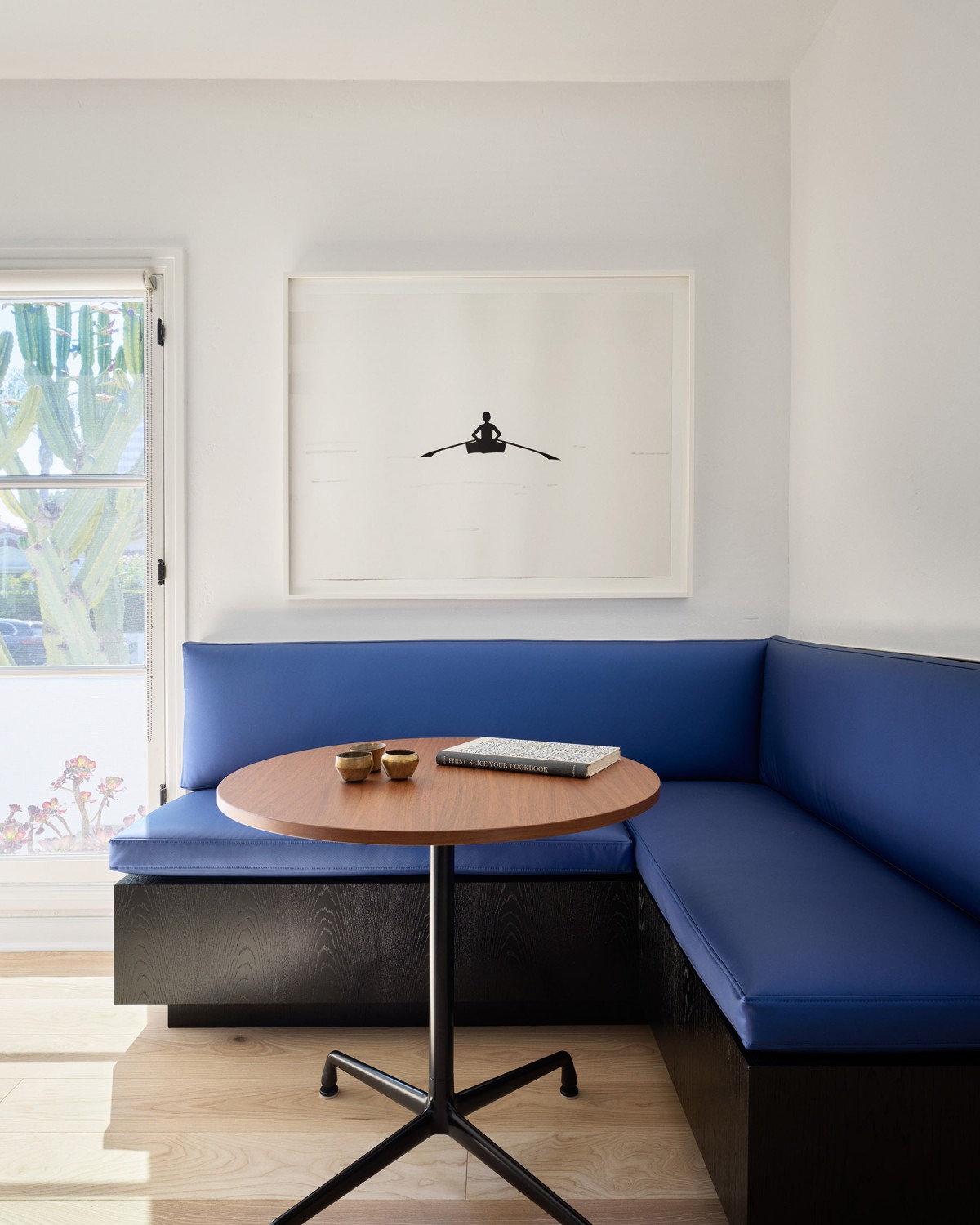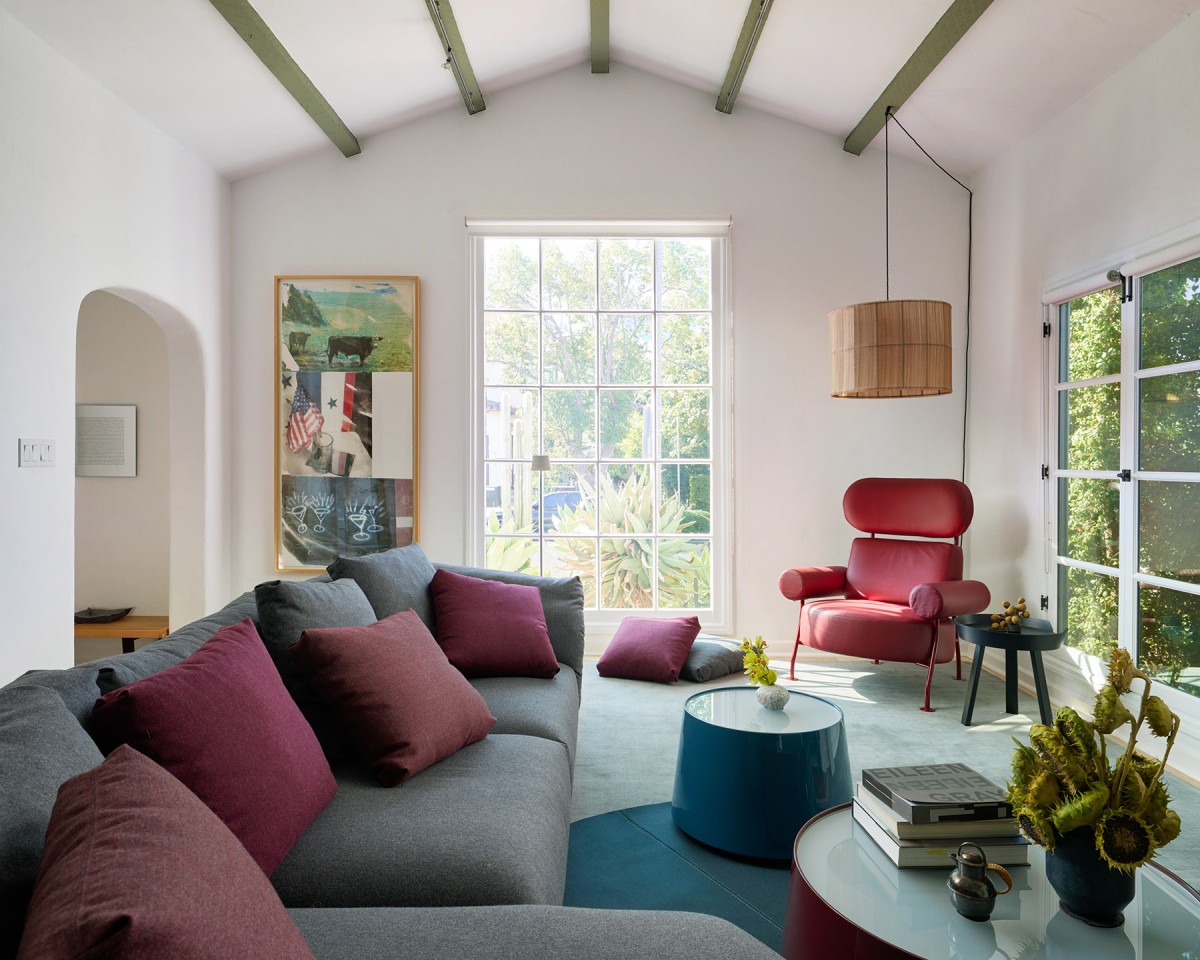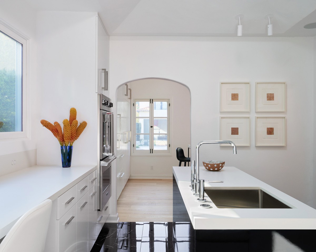 A reworking of the primary spaces of a 1928 Spanish Revival Bungalow in Los Angeles to create a vibrant living room, dining room, entertaining kitchen and a multifunctional butler's pantry, laundry suite and household task desk from a warren of cramped rooms. The new layout is carefully calibrated for the art collector client to live along side her favorite works throughout the house. A palette of black and white in the new kitchen and butler's pantry plays on the white box of the gallery and black box of the theater to evoke the new public nature of these rooms as display spaces. In the living and dining room the new furnishings and textiles offer a soft partner in muted and saturated colors to the art hung in the large room while making it perfect for lounging.