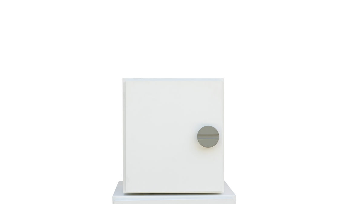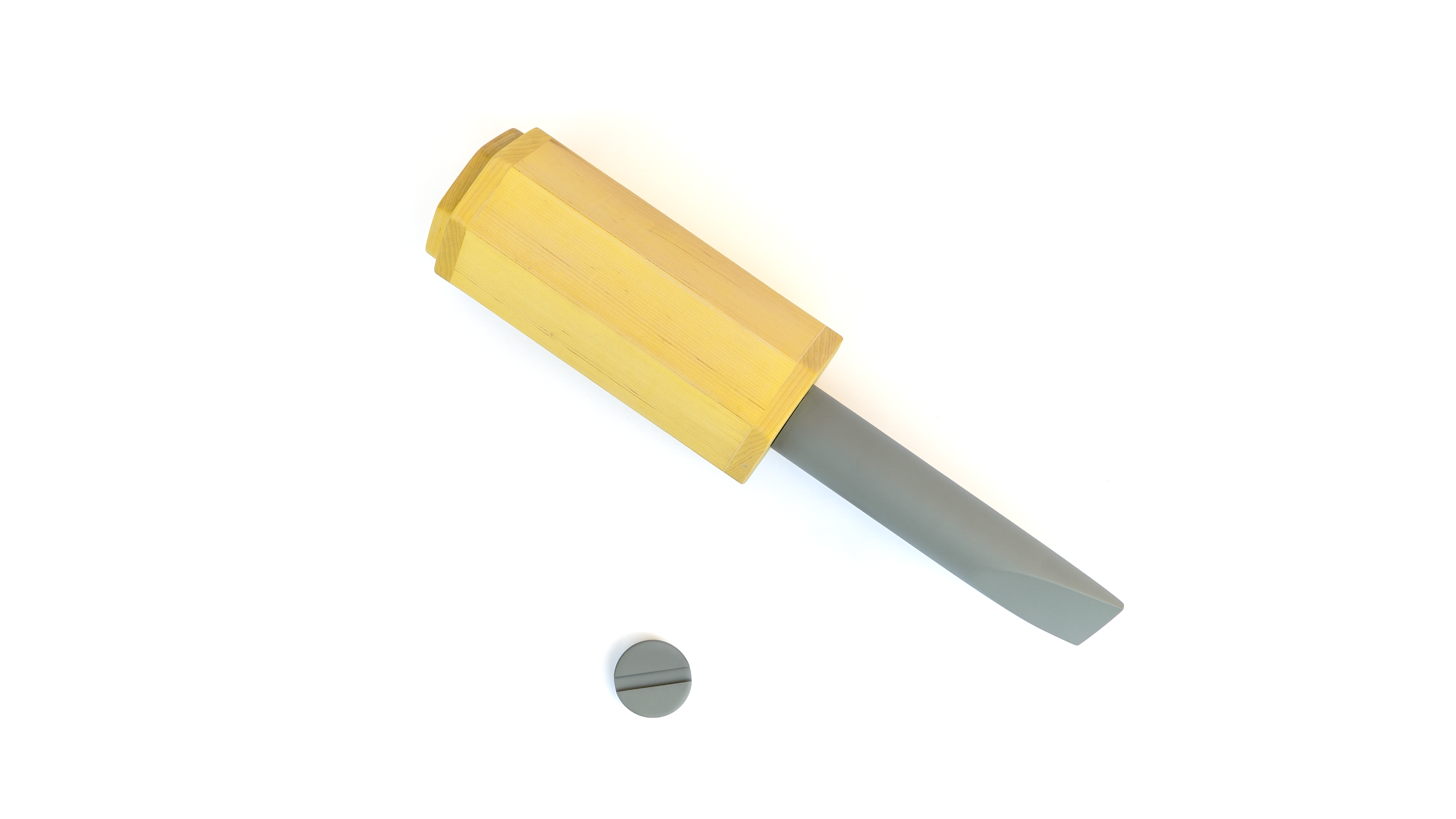 Screw Knobs are large, graphic cabinet knobs modeled after the head of a flathead screw. They are shaped of solid oak and painted with durable Milk Paint with a 3" diameter. We pair them here with a large screwdriver for performative assembly. See them in action in our 1939 Compound .