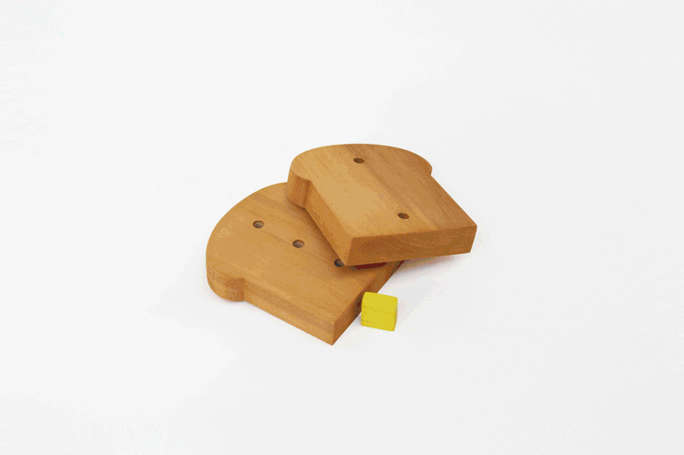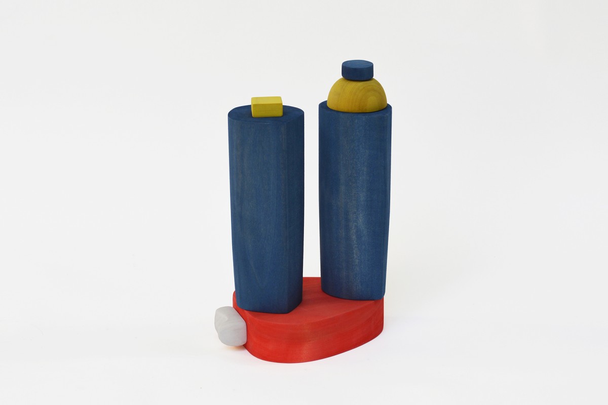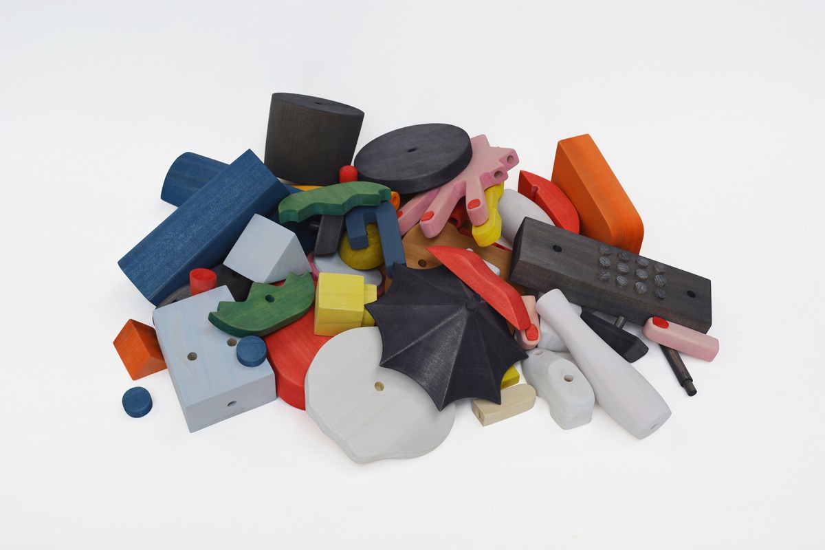 A set of wood toys. Familiar objects disassemble and reassemble into myriad new hybrids.